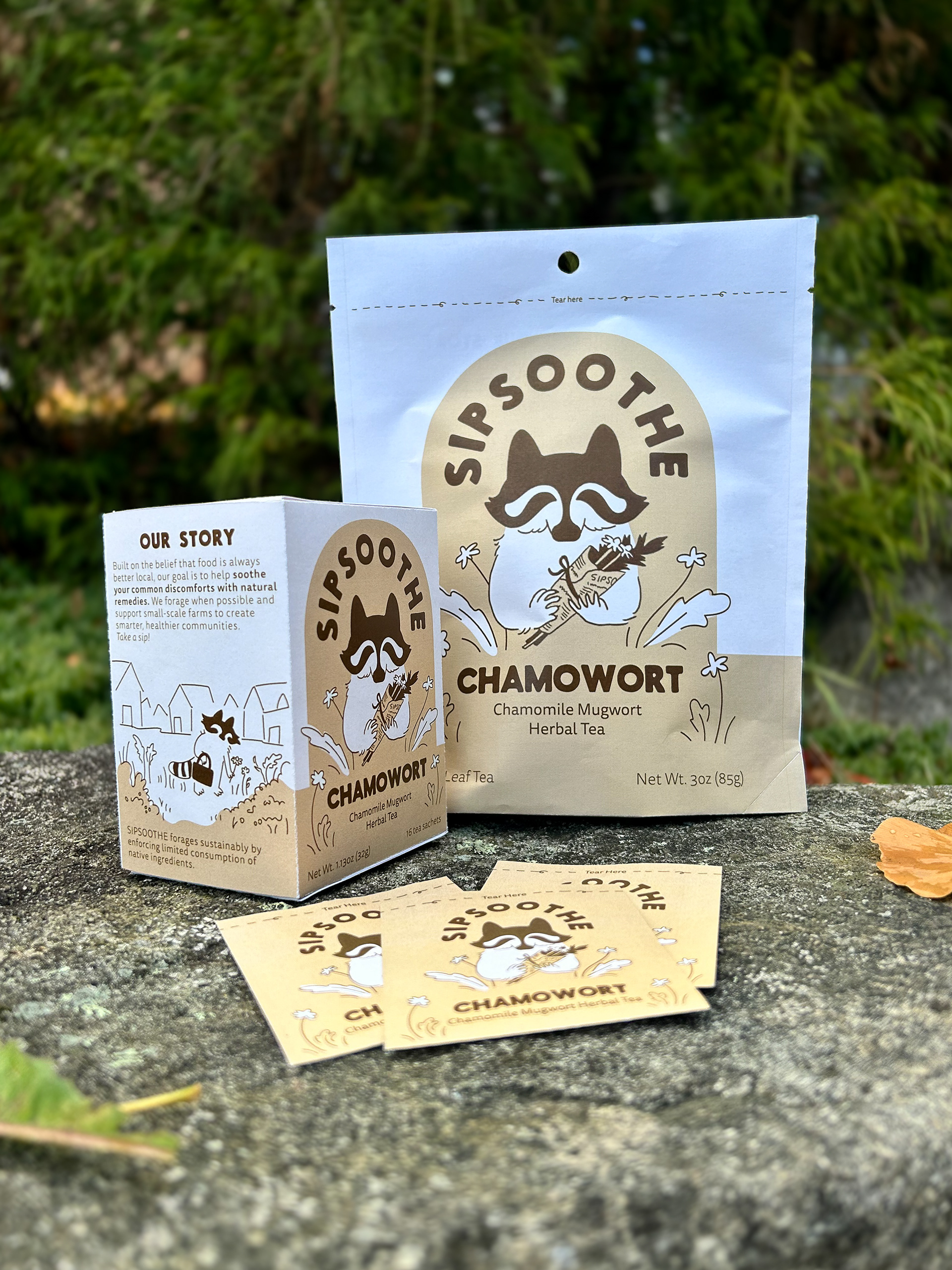 Sipsoothe is a fictional tea brand inspired by a friend who gave me a cup of mugwort tea for my stomach cramps. I've never been one to forage, but the idea of collecting to help people with common ailments is something I wanted to explore as a real business.
